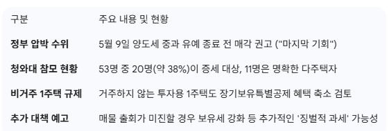 - 5월 9일 데드라인: 정부는 양도세 중과 유예 종료를 앞두고 다주택자들에게 매각을 강력히 압박하고 있습니다.