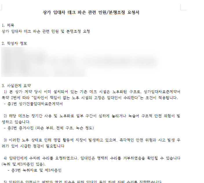데크 수선비용과 손님 부상에 대한 치료비 책임 등을 기록하여 건물주에게 내용증명을 보낼 예정입니다.