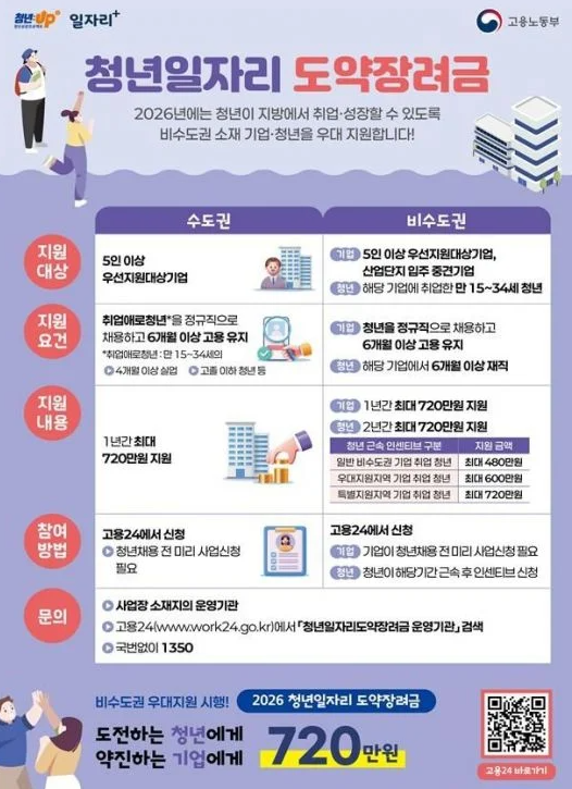 - 비수도권 취업 혜택 강화: 6개월 이상 근무 시 2년간 최대 720만 원의 근속 인센티브 지급!