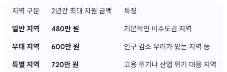 기존에는 지원 한도가 최대 480만 원 수준이었는데, 올해부터는 지역에 따라 최대 720만 원까지 상향되었습니다. 단, 모든 비수도권이 똑같은 건 아니고요, 지역의 특성에 따라 세 가지 유형으로 나뉘게 됩니다. 아래 표를 보시면 한눈에 이해가 되실 거예요!