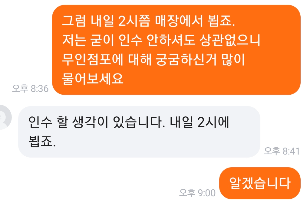 어느정도 양도준비가 마무리되고 본격적으로 매장을 인수하기 위해 양수자와 일정을 조율하여 매장 운영에 대한 전반적인 내용을 전달했습니다.