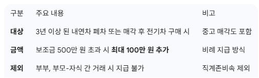 대상은 출고된 지 3년 이상 된 내연기관차(휘발유, 경유 등)를 폐차하거나 중고로 매각하고 전기차를 구매하는 분들입니다.
