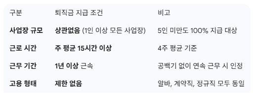 요약하자면 '5인 미만 괜찮음!', '주 15시간 이상!', '1년 이상 근무!' 이 세 가지만 기억하시면 된답니다.