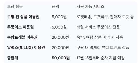 결론적으로 쿠팡의 이번 보상안은 대규모 인원에게 혜택을 돌려준다는 점에서는 의미가 있지만, 실제 소비자들의 생활 패턴을 고려하면 '실질적 보상'보다는 '자사 서비스 홍보'의 느낌이 강한 것이 사실입니다.