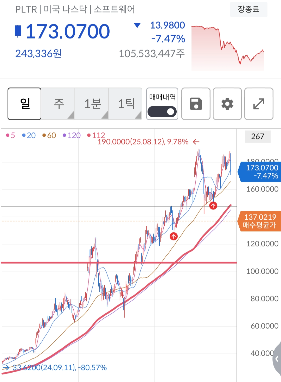 중형 AI주인 팔란티어에도 ‘도미노식 조정’이 들어왔다고 할수 있습니다.
