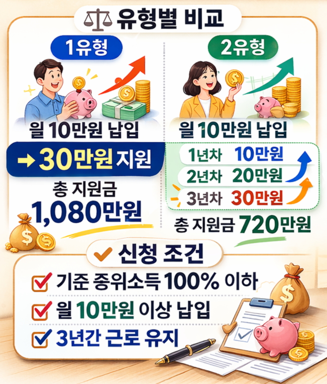 - 소득이 낮을수록 혜택이 큰 **1유형(3배 매칭)**인지 먼저 확인하세요.