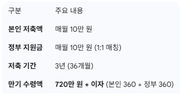 "내가 10만 원을 저축하면, 정부도 10만 원을 얹어준다"고 생각하시면 쉬워요. 3년 뒤에는 내가 낸 돈의 딱 두 배가 되어 돌아오는 구조인 셈이죠.