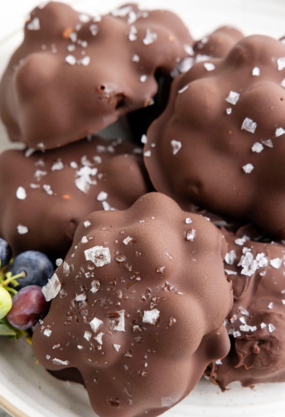 5️⃣ 빠른 코팅: 얼린 클러스터를 따뜻한(약 31°C) 초콜릿에 담갔다 빠르게 꺼냅니다. 이때 소금 한 꼬집을 뿌리면 맛이 극대화됩니다!