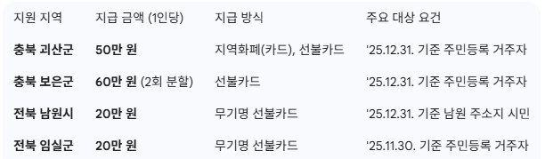 이번 지원금의 핵심은 '어디에 살고 있느냐'입니다. 충북 괴산군과 보은군, 그리고 전북 남원시와 임실군이 대표적으로 앞장서고 있어요.