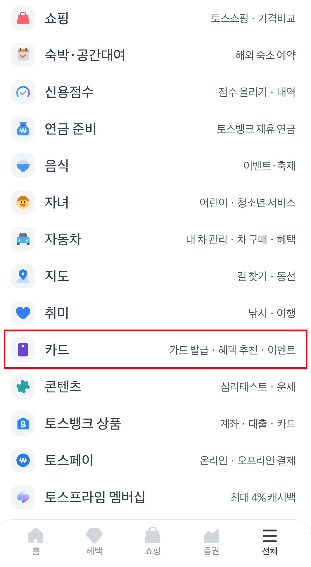 토스에서는 모든 카드가 한 화면에 정리되니까 훨씬 깔끔했습니다.