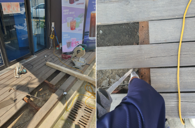 매장 입구에 설치된 데크가 노후화로 인해 제구실을 못하고 푹푹 꺼지는 사태가 발생했던 것이죠.