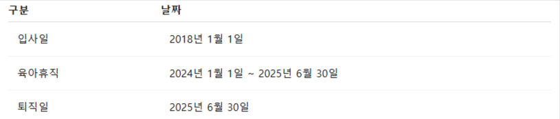 이 경우 근속연수는 약 7년 6개월, 육아휴직 기간까지 전부 포함된 기간으로 계산됩니다. 여기서 줄어드는 건 하나도 없어요.