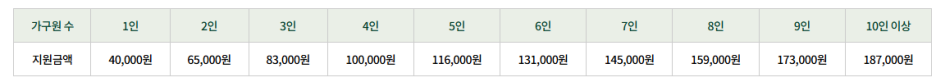 [가구원 수별 지원 금액 (월 단위)] 1인 가구는 4만 원부터 시작해서 4인 가구는 딱 10만 원을 채워줍니다! 가구원이 많을수록 혜택이 커져서 10인 이상은 무려 18만 7천 원까지 나와요.