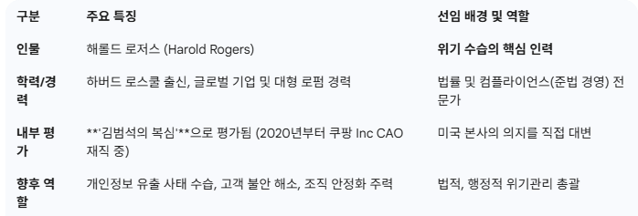 쿠팡은 박 대표의 후임으로 해롤드 로저스 쿠팡 Inc. 최고관리책임자(CAO) 겸 법무총괄을 쿠팡의 임시 대표로 선임했어요. 이 인선에는 몇 가지 중요한 의미가 담겨있습니다.